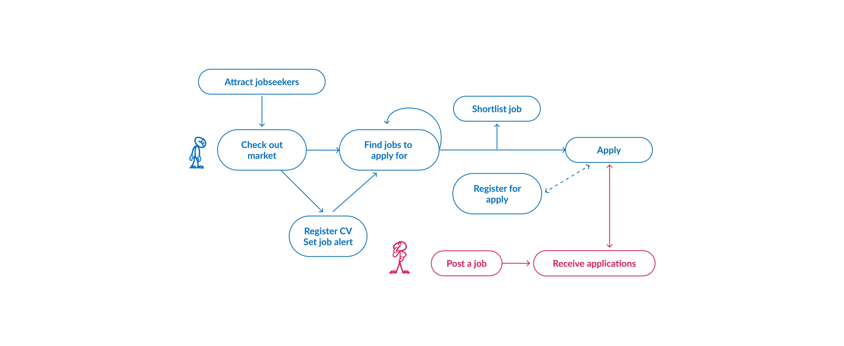 Product hypotheses: We formulated hypotheses about what changes or additions might improve the user experience and efficiency of our platform. For example, by scrapping jobs we will bring more content to our site, which will bring more job seekers to apply, this will result eventually in more recruiters coming to post their ads directly.
