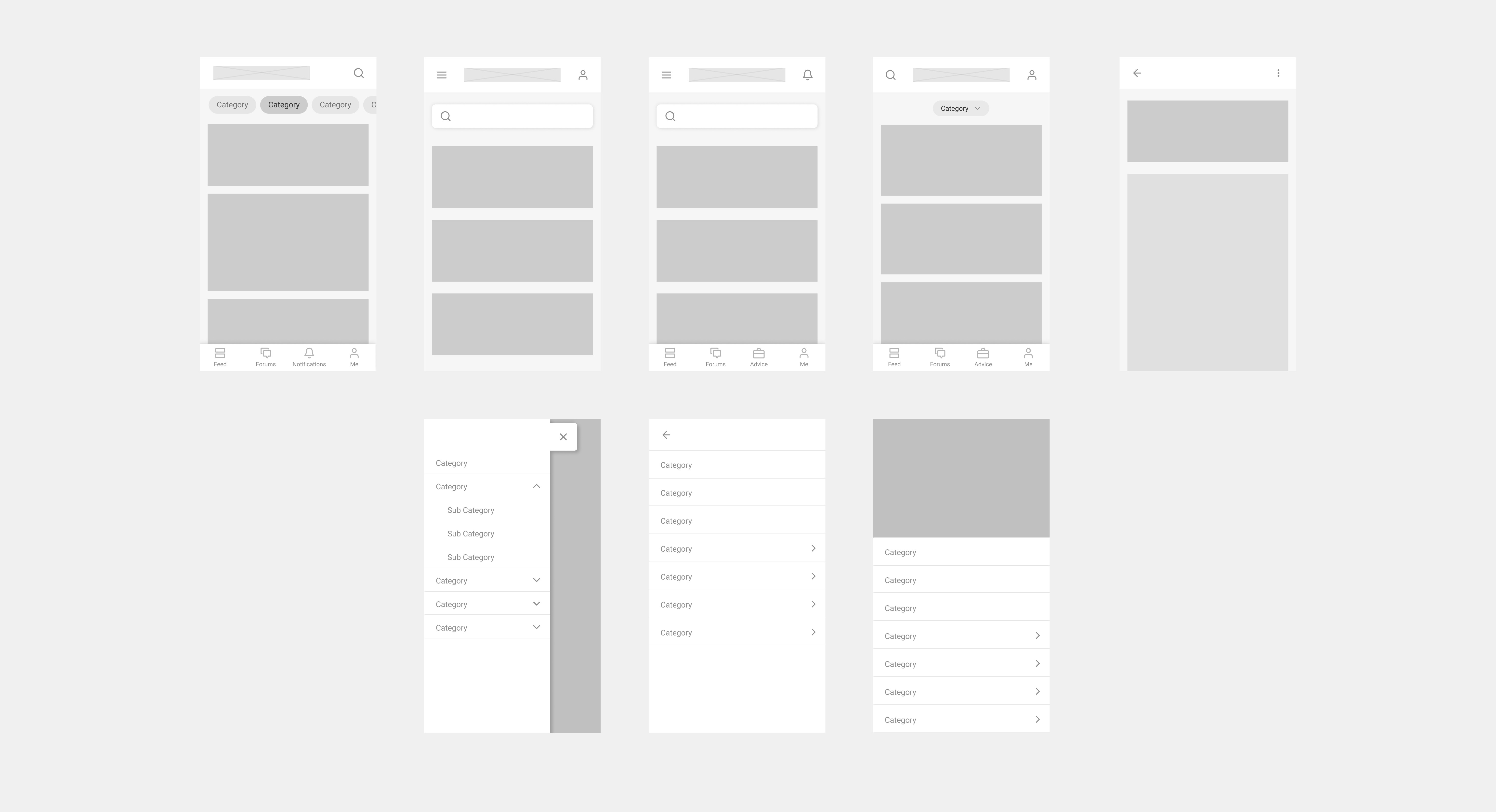 On first phases of the project I created different wireframes to visualise navigation patterns, key to structure the different categories and levels needed.