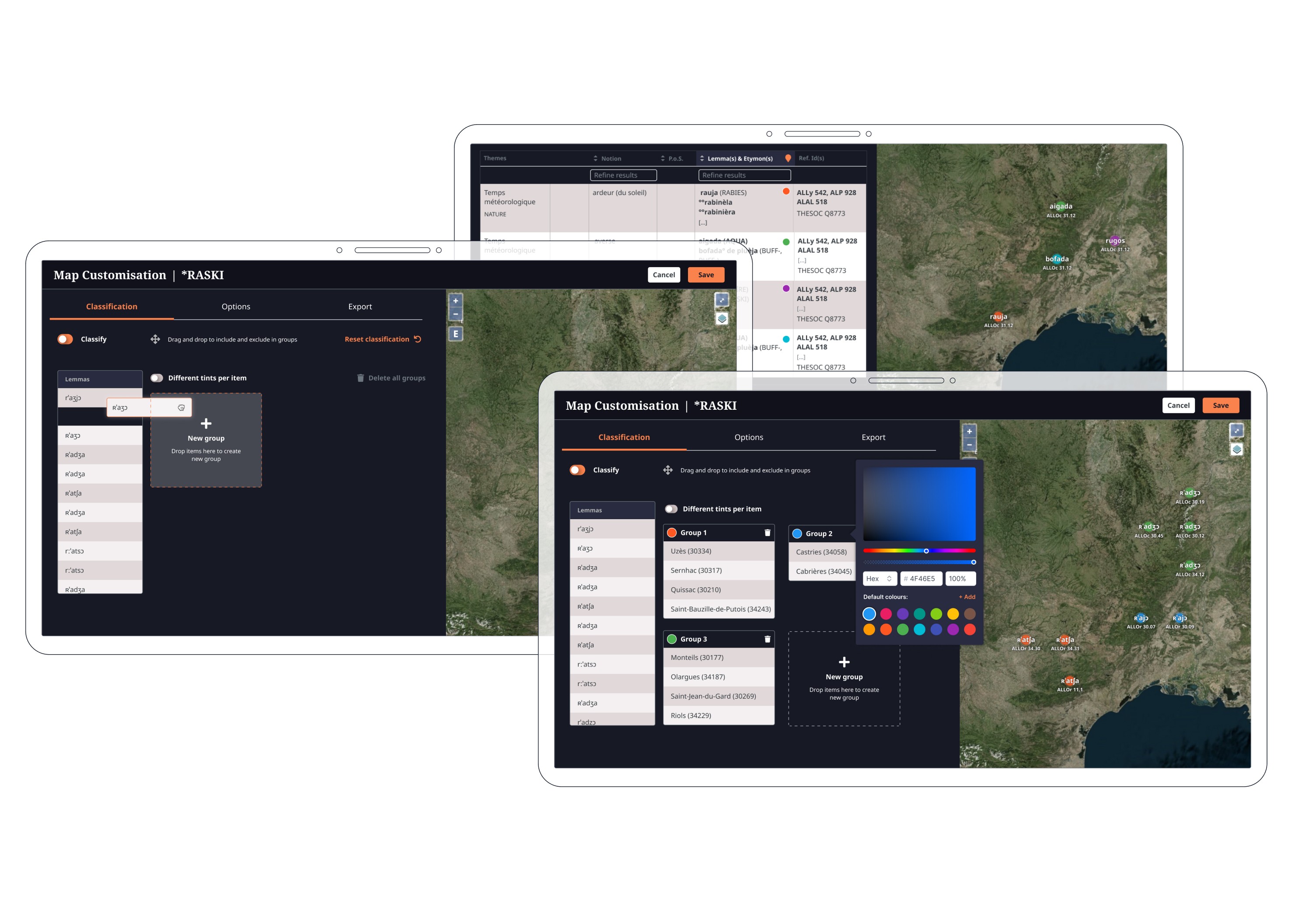 The advanced user would have a way to edit their own maps, creating and editing their groups by simple drag and drop. They can also decide on certain map styling options, and export them in different formats so they continue with their studies offline. Since most of these options would be used in daily tasks, the interface had everything they needed on hand.